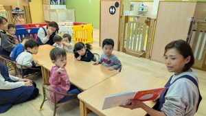 活動の始まりは、おにぎりの絵本の読み聞かせから。みんなワクワクした表情です!