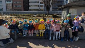 鬼退治の後は、お気に入りのお面を被ったまま、みんなで近くの公園までお散歩に出かけました。